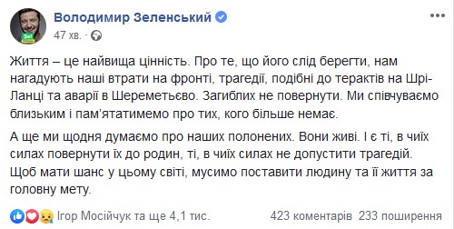 "Жизнь - это высшая ценность. О том, что ее нужно беречь, нам напоминают наши потери на фронте, трагедии, подобные терактам на Шри-Ланке и аварии в Шереметьево. Погибших не вернуть. Мы сочувствуем близким и будем помнить о тех, кого больше нет", - написал он.