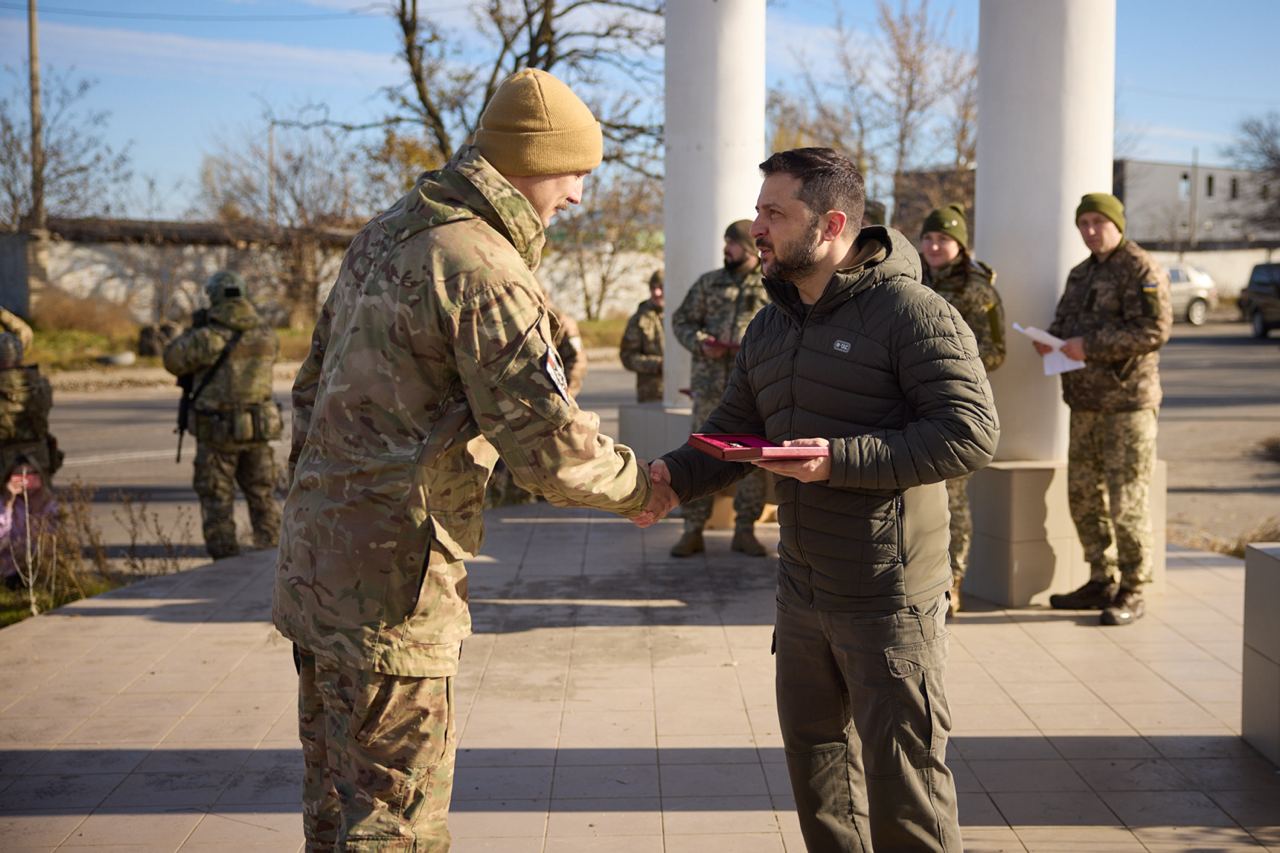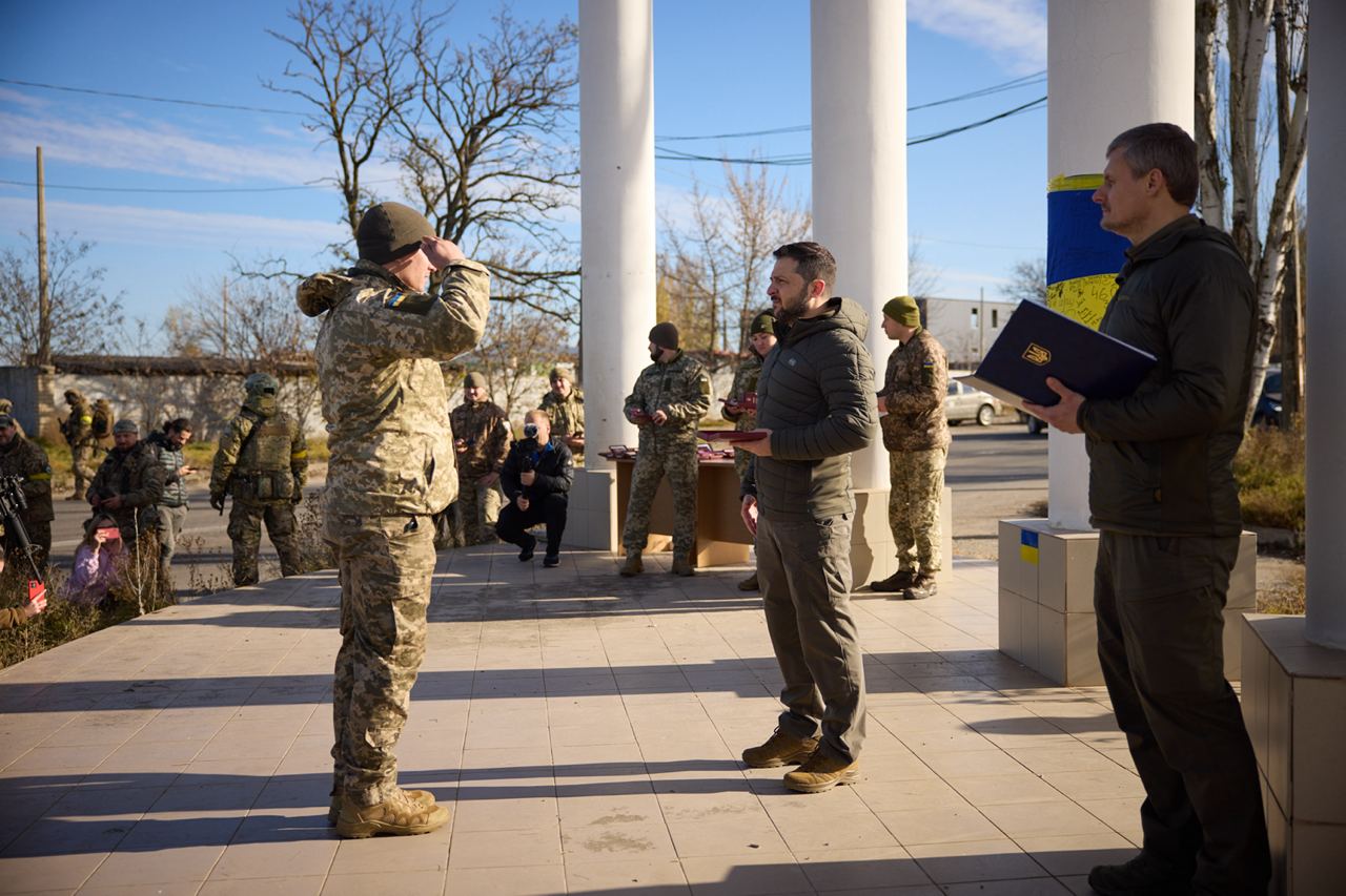 Во время визита президент Зеленский лично наградил украинских героев-защитников почетными наградами за службу и вклад в освобождение Херсона.