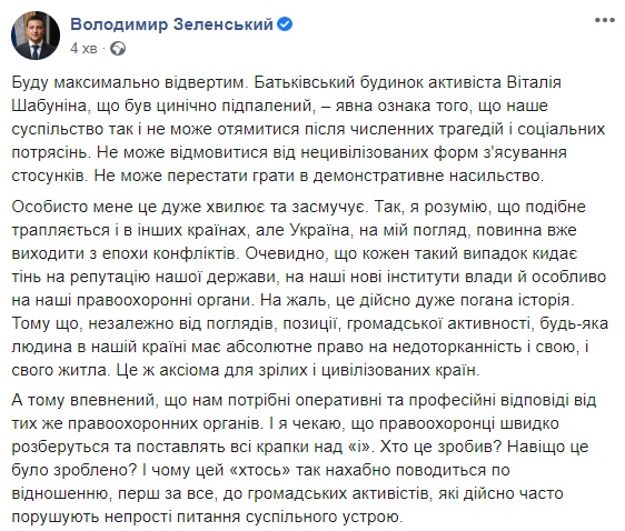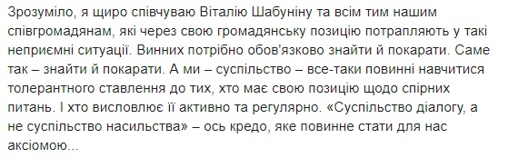 "Буду максимально откровенным. Родительский дом активиста Виталия Шабунина, который был цинично подожжен, - явный признак того, что наше общество так и не может прийти в себя после многочисленных трагедий и социальных потрясений. Не может отказаться от нецивилизованных форм выяснения отношений. Не может перестать играть в демонстративное насилие.
