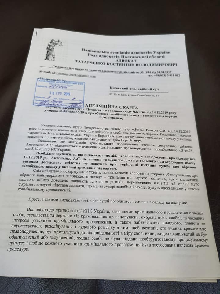 В апелляции Татарченко отмечается, что его подзащитный Антоненко "действий, перечисленных в сообщении о подозрении от 12.12.19 не совершал", а следствие не предоставило "ни одного документального подтверждения совершения преступления".