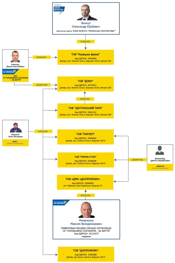 Журналисты указывают на подтвержденную связь Евгения Моршинина, исполнителя мошеннической схемы продажи днепровских агропредприятий за 160 млн гривен и дальнейшего их рейдерского захвата, и политика Александра Вилкула и его доверенного лица Максима Романенко. Как пишет СМИ, ссылаясь на данные госреестров, эта связь прослеживается через подконтрольные коммерческие предприятия, адреса их юридической регистрации, а также директоров.