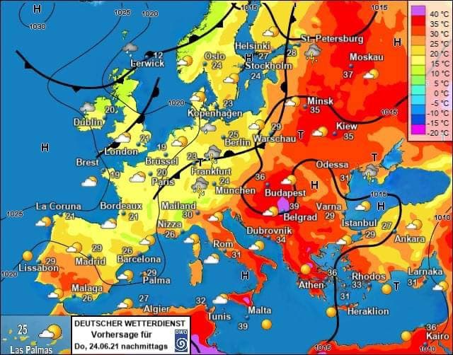 По ее словам, в четверг, 24 июня максимальная температура воздуха в большинстве областей Украины составит +29-33 градуса, местами будет достигать +33-35. В то же время в большинстве стран Западной Европы и даже в Мадриде будет свежее.