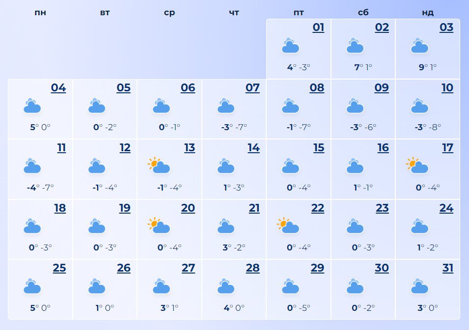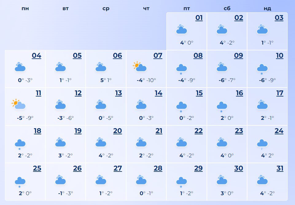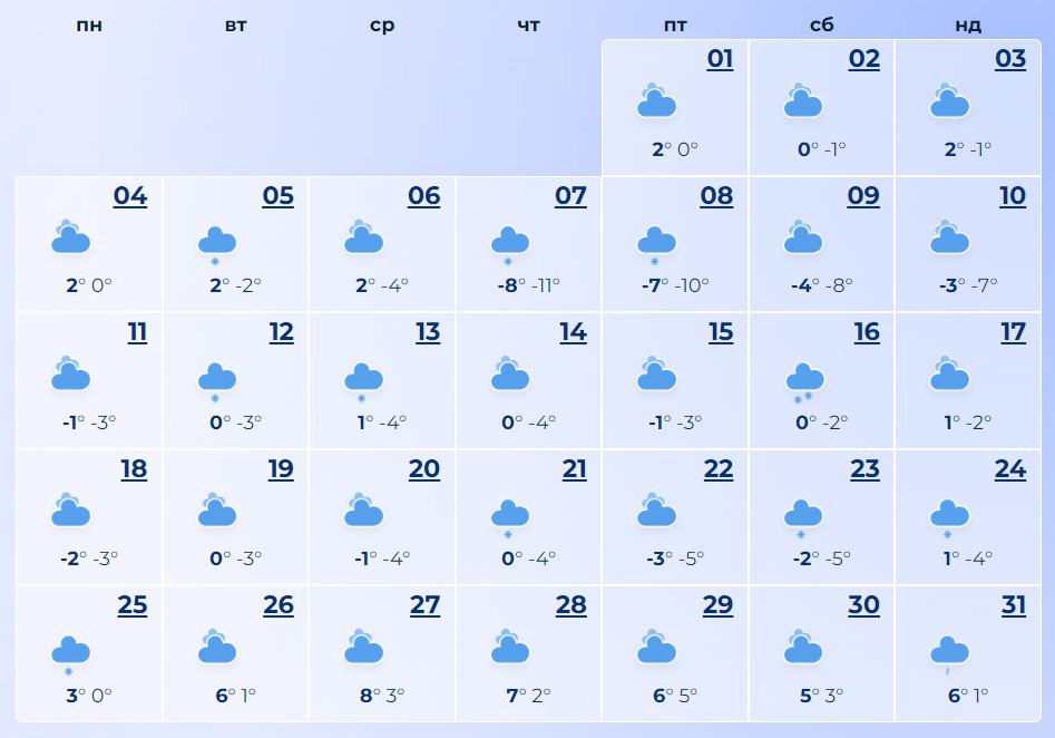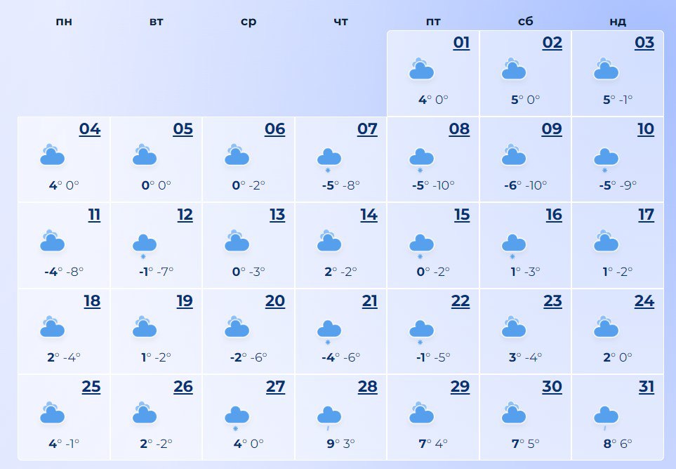 Чернигову повезло со снегом больше, чем другим: по крайней мере треть месяца будет идти легкий снег. В начале месяца до минус 11, в конце – до 8 тепла.