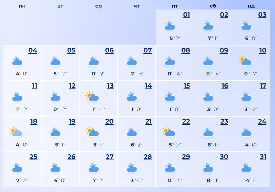 В Днепре в начале месяца следует ожидать мороз до минус 7, но без снега. К концу месяца дневная температура поднимется до +8.
