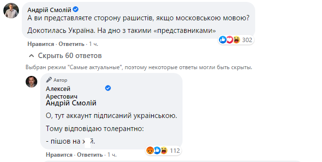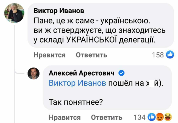 Позже Арестович удалил этот комментарий с оскорблением. Но послал с такими же словами другого пользователя, уже на украинском.