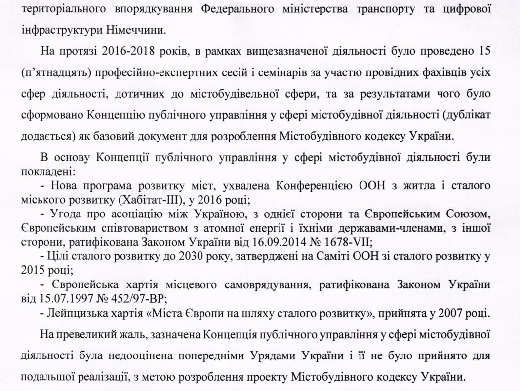 "В течение 2016-2018 было проведено 15 (пятнадцать) профессионально-экспертных сессий и семинаров с участием ведущих специалистов всех сфер деятельности, причастных к градостроительной сфере, и по результатам чего была сформирована Концепция публичного управления в сфере градостроительной деятельности как базовый документ для разработки Градостроительного кодекса Украины", – говорится в документе.