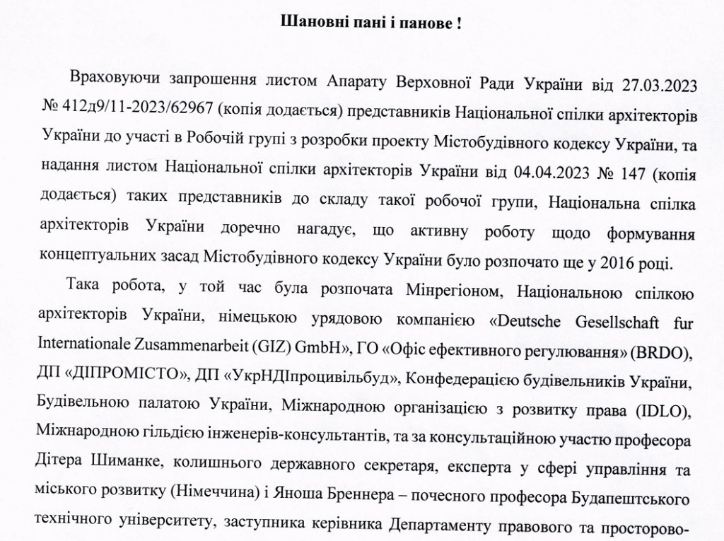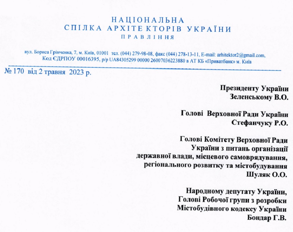 "Национальный союз архитекторов Украины считает, что при разработке проекта Градостроительный кодекс Украины должен обязательно учесть те прогрессивные моменты, которые включает в себя законопроект "О внесении изменений в некоторые законодательные акты Украины по реформированию сферы градостроительной деятельности" (№ 5655)", – говорится в письме.