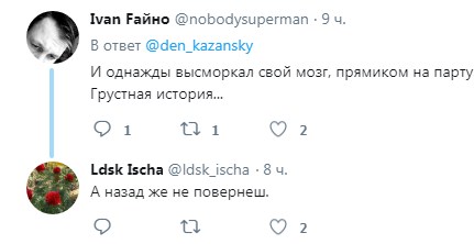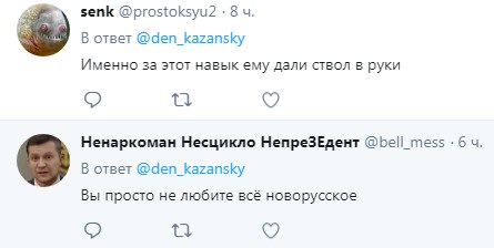 Пользователь Twitterнисколько не удивились особым умениям человека с фотографии, и пошутили, что за примерно такие же таланты многие боевики из рожденных в Украине получили оружие. Также они отметили стремительный карьерный рост боевика и его большой потенциал – согласно данным сайта "Миротворец" он является "заместителем командира взвода, сержантом республиканской гвардии террористов ДНР".