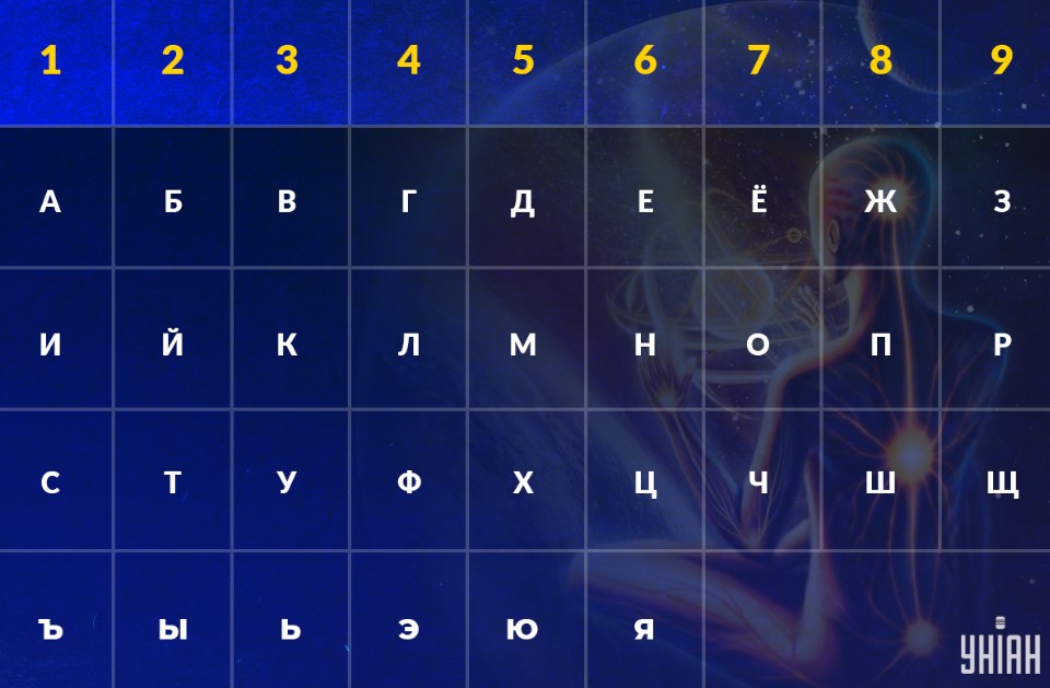 На листе следует написать свое имя и фамилию, а напротив них проставить цифры, приведенные в таблице ниже. Для женщин, состоящих в браке, можно определить сначала кармические задачи, которые даны при рождении, через девичью фамилию, а затем рассчитать свой новый жизненный путь с фамилией мужа, если ее меняли.
