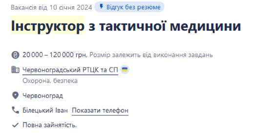 Также требуются инструкторы по тактической медицине. В описании отмечается, что работника ищут в Азов, в 12 бригаду специального назначения НГУ. Заработную плату готовы платить от 20 тыс. до 120 тыс. грн. Размер будет зависеть от выполнения задач.