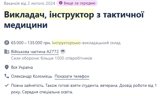 В частности, в одной из вакансий отмечается, что требуется преподаватель-инструктор для работы в компании "Военная часть А2772". Которому нужно будет проводить подготовку и обучать военнослужащих сил специальных операций. Заработную плату обещают от 65 тысяч до 135 тысяч гривен.
