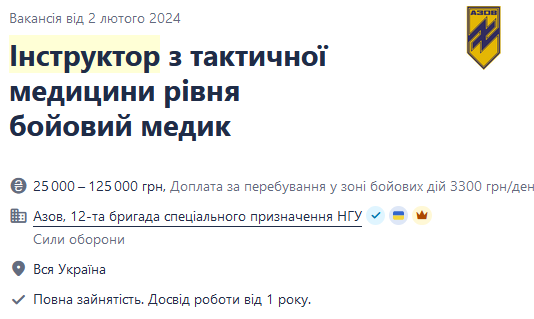 Еще в одной вакансии сообщается, что нужен инструктор по тактической медицине уровня "боевой медик" в бригаду "Азов". Заработная плата будет составлять от 25 тыс. до 125 тыс. грн, доплаты за пребывание в зоне боевых действий 3,3 тыс. грн/день.
