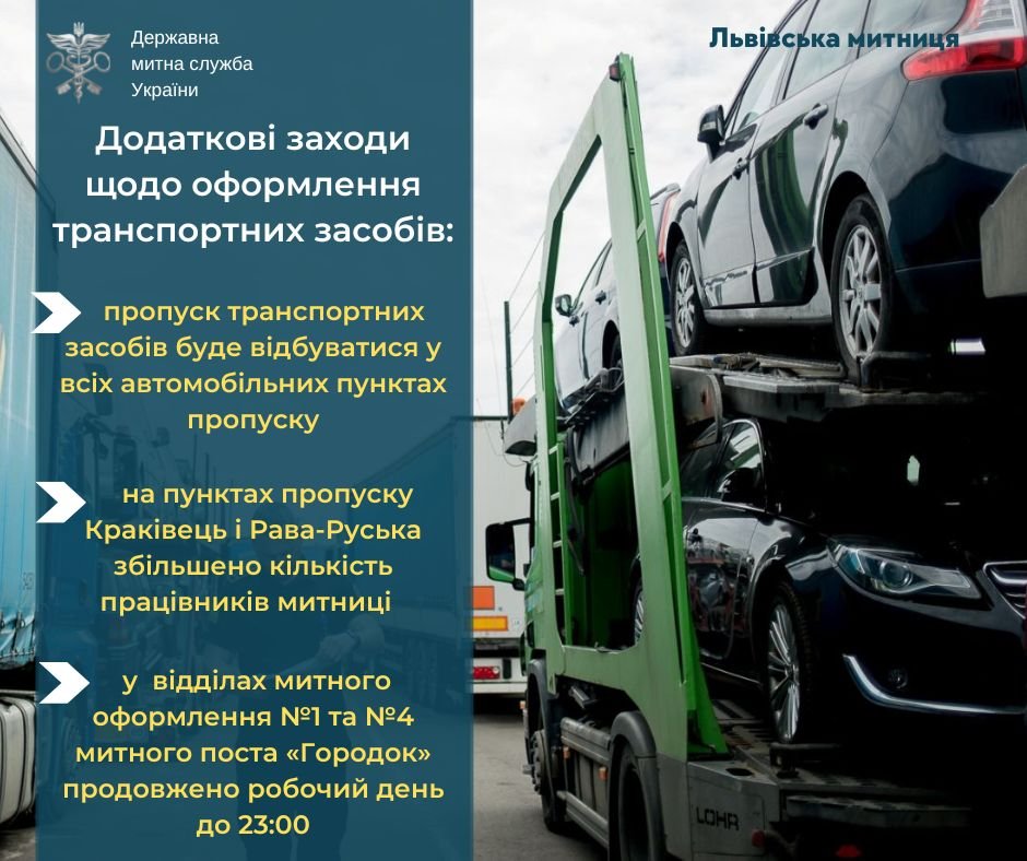 "29 и 30 июня работа подразделений таможенного поста "Городок" (отдел таможенного оформления №2, расположенный в г. Городок, и отдел таможенного оформления №4 в с. Зимная Вода Львовской области) будет продолжена до 23:00, до начала действия комендантского часа... такой формат работы продлится до конца июня", - отметило руководство таможни.