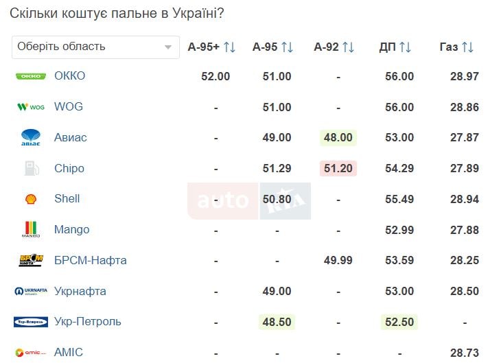 Усредненные цены на АЗС Украины, они могут отличаться в зависимости от региона