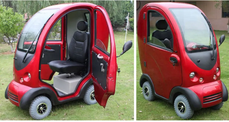 Миниатюрный одноместный скутер с закрытым пластиковым кузовом имеет четыре колеса.