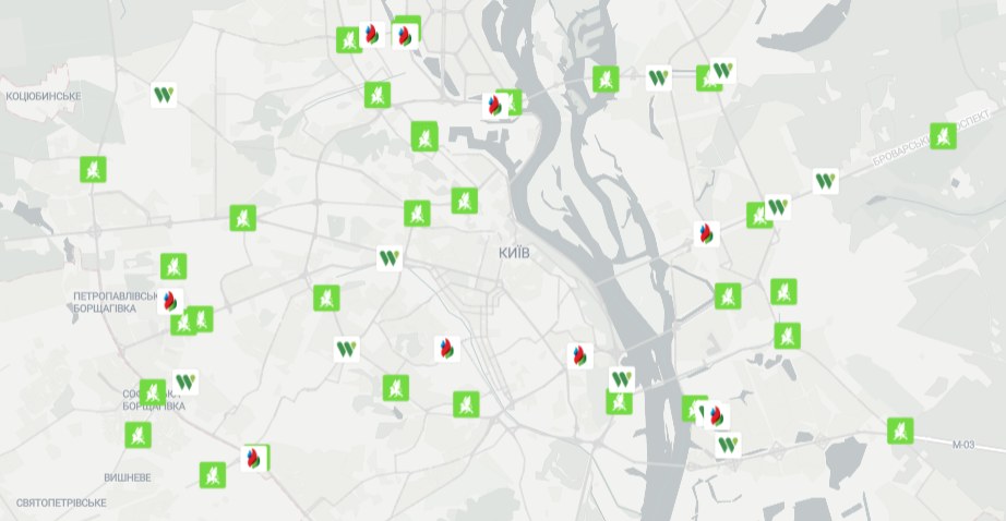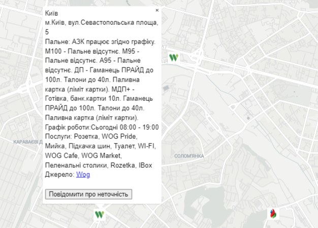 Информации об очередях на данный момент нет. В основном на карте представлены АЗС сетей WOG, OKKO и Socar.