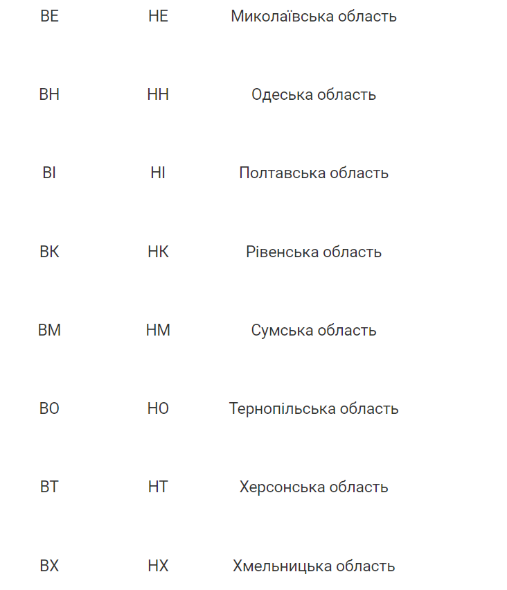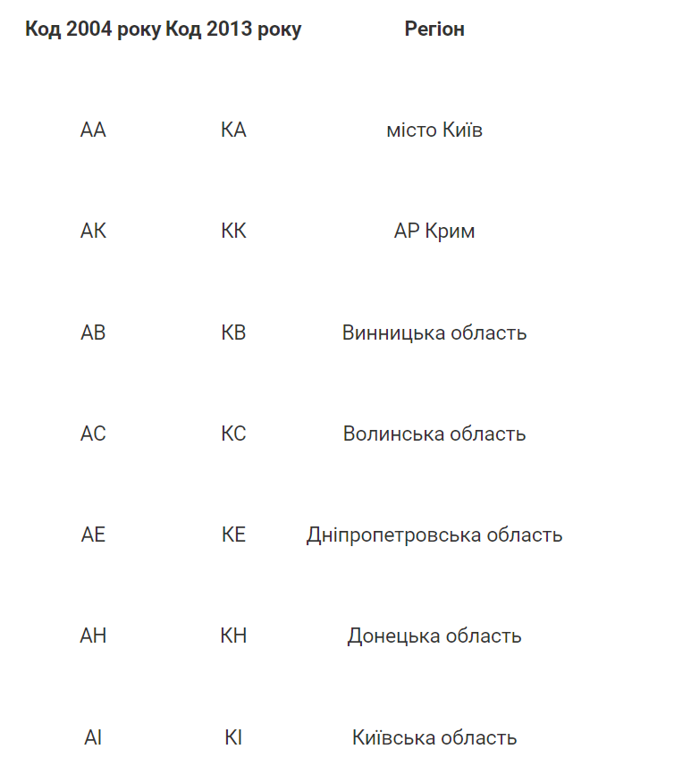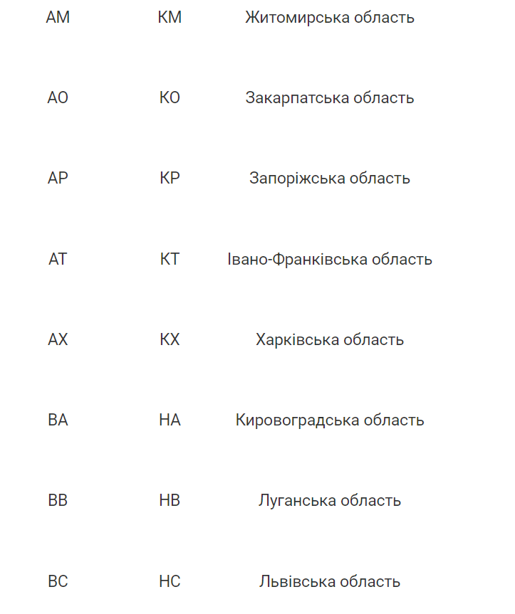 Таблица номерных знаков Украины