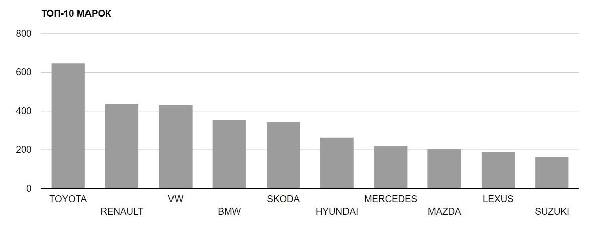 Первое место рейтинга по количеству продаж с большим отрывом заняла японская марка Toyota - в марте зарегистрировано 648 штук.