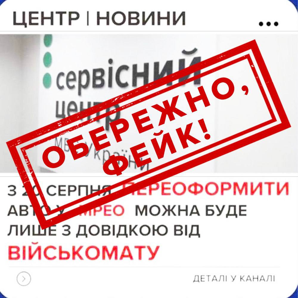 "В сети активно распространяется месседж, якобы с 20 августа для перерегистрации авто в Сервисные Центры МВД клиент должен предъявить справку из военкомата. Официально заявляем, эта информация не соответствует действительности и никаких документов физическим лицам от территориальных центров комплектации предоставлять не нужно", – говорится в сообщении.