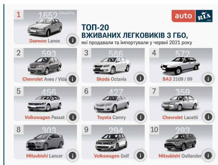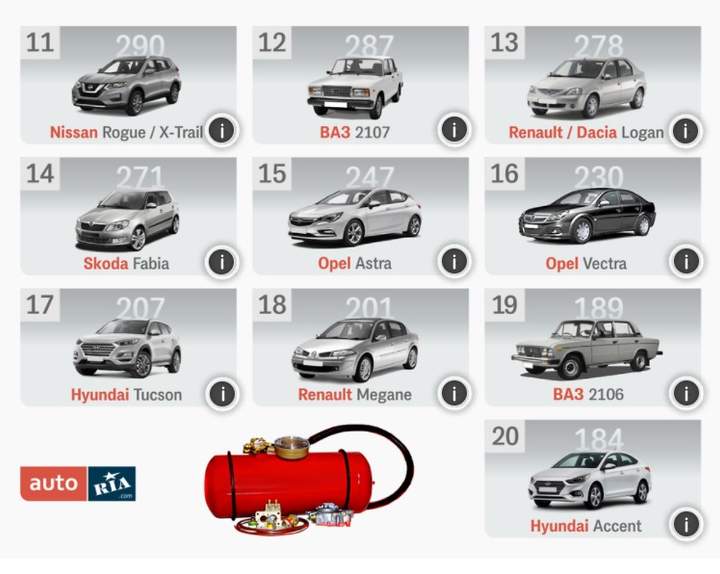 В Украине стали меньше торговать бюджетными или ранними моделями, к которым можно отнести ВАЗ 2109/99, ВАЗ-2107, Renault Logan, Skoda Fabia. Однако при этом уверенно зафиксировали свои позиции и даже немного поднялись вверх автомобили с "объемными" двигателями без прямого впрыска бензина и турбонаддува, на которые целесообразно установить ГБО для уменьшения затрат на топливо. К таким относятся Volkswagen Golf, Nissan Rogue, Hyundai Tucson и некоторые другие.