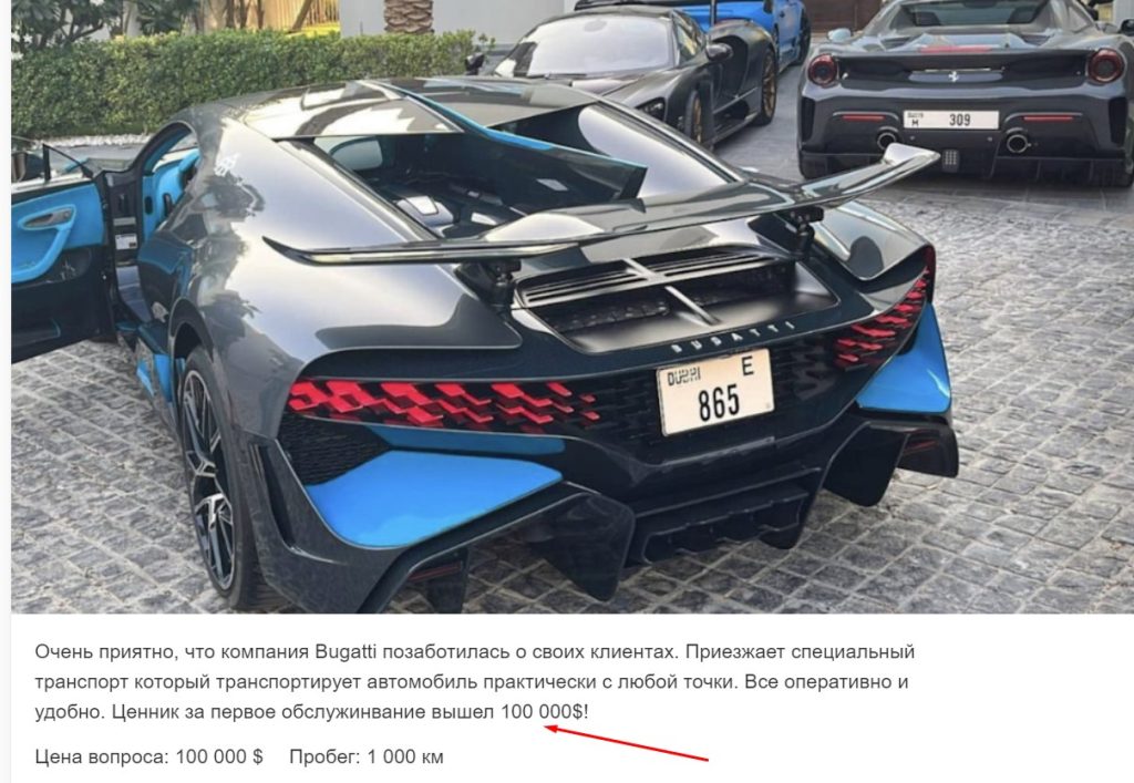 Он уже успел проехать на собственном Бугатти 1000 километров и провел первое техническое обслуживание за 100 тысяч долларов.