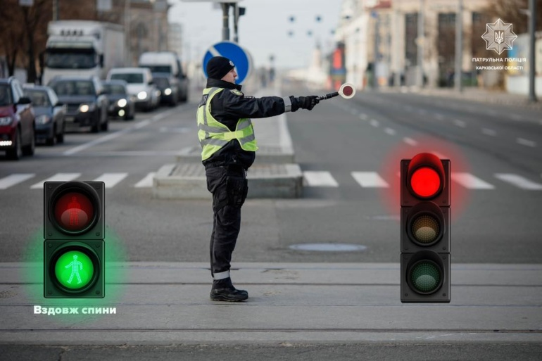 Жест регулировщика во время дорожного движения: регулировщик стоит перед участниками дорожного движения лицом, в правой руке жезл или красный диск, она вытянута вперед.