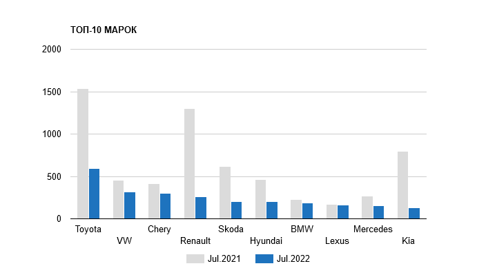 Так, в прошлом месяце наиболее популярными среди покупателей стали автомобили японской марки Toyota. Было продано 596 машин. Однако по сравнению с таким же показателем прошлого года результат отстал на 61%.