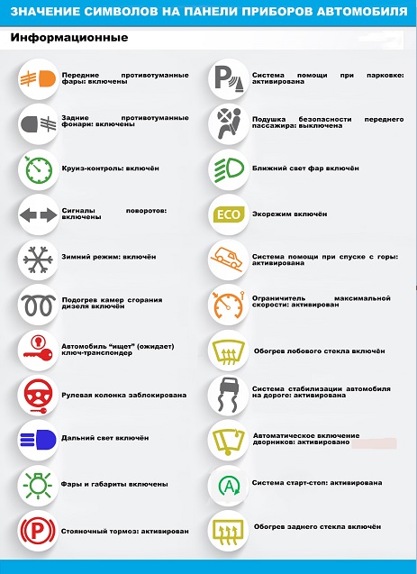 Зеленые "значки" всегда сообщают о положительных явлениях: какая-то система активирована, какой-то прибор включен или находится в состоянии ожидания. Нужно отметить, что на самом деле далеко не все значки в "информационной" группе имеют зеленый цвет – есть тут и оранжевые, и красные, и даже синие.