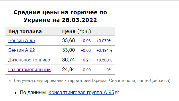 Так, по состоянию на 28 марта средние цены на бензин А-95 и А-92 по сравнению с предыдущим торговым днем 25 марта повысились на 3 и 6 копеек – горючее начало стоить 33,68 грн/л и 33,00 грн/л соответственно.