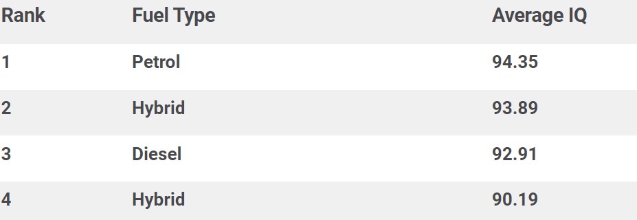 Самый высокий коэффициент интеллекта показали владельцы машин на бензине – 94,35 баллов IQ. Гибриды покупают люди с коэффициентом интеллекта 93,89. Еще более низкий уровень интеллекта имеют владельцы авто на дизельном топливе – 92,91. Электрокары же есть у водителей, которые участвовали в исследовании компании, с 90,19 баллами IQ.