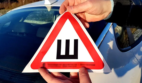 Буква "Ш" в красном треугольнике означает, что автомобиль, на котором висит этот знак, имеет шипованные колеса и уведомляет водителей сзади о необходимости удерживания минимального расстояния в связи с укороченным тормозным путем.