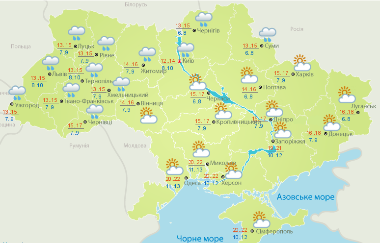 Температурных качелей не ожидается: на западе температура воздуха будет в пределах +14...+17 днем и +8...+11 ночью. В центральных областях +14...+18 днем и +8...+12 ночью. На севере страны +14...+17 днем и +8...+11 ночью. На востоке +17...+21 днем и +10...13 ночью. В южных областях +21...+25 днем и +12...+16 ночью.