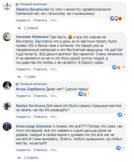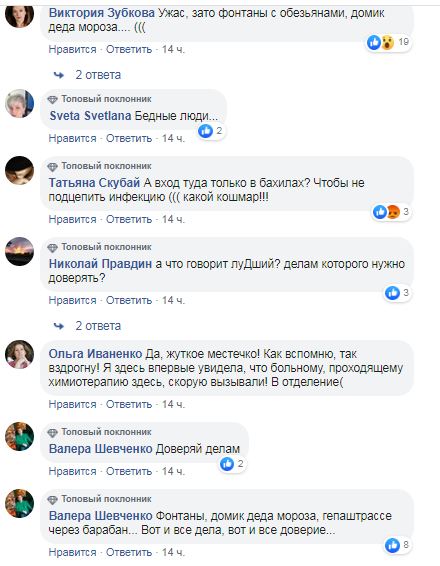 "Ужас, зато фонтаны с обезьянами, домик Деда мороза", "Да, жуткое местечко! Как вспомню, так вздрогну! Я здесь впервые увидела, что больному, проходящему химиотерапию здесь, скорую вызывали! В отделение", "А почему это все??? Потому что сами, как лохи последние, все это хаваем и сидим дальше дома на диване, каждый в своем мирке и думаем что это все нас не коснется! Сами виноваты. Власть, любую нынешнюю, на любых местах, на вилы", "Для меня это было самым страшным местом на земле, как бы это развидеть", - пишут в комментариях.