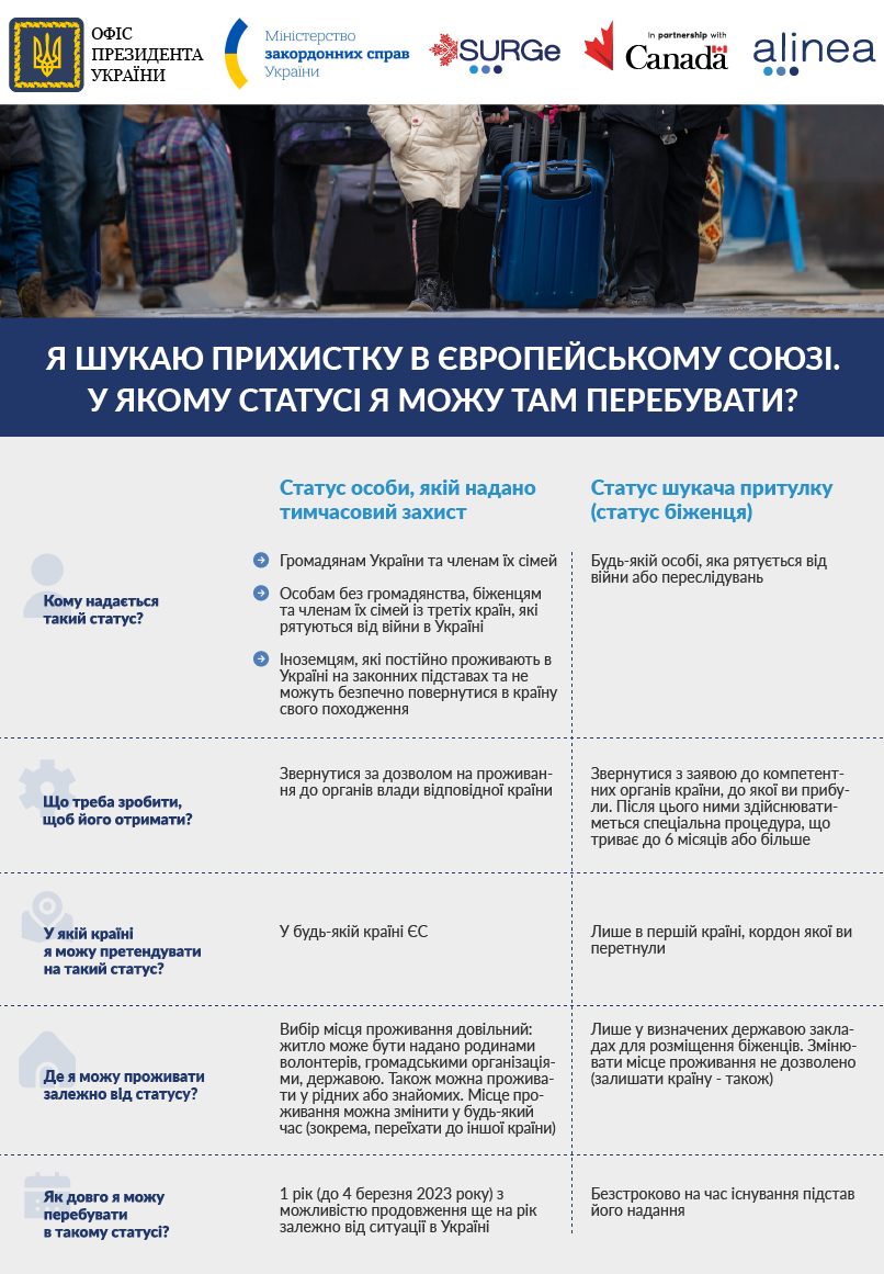 Граждане Украины, которые бегут от войны в страны Евросоюза, могут получить статус беженца или статус искатель убежища (на выбор).