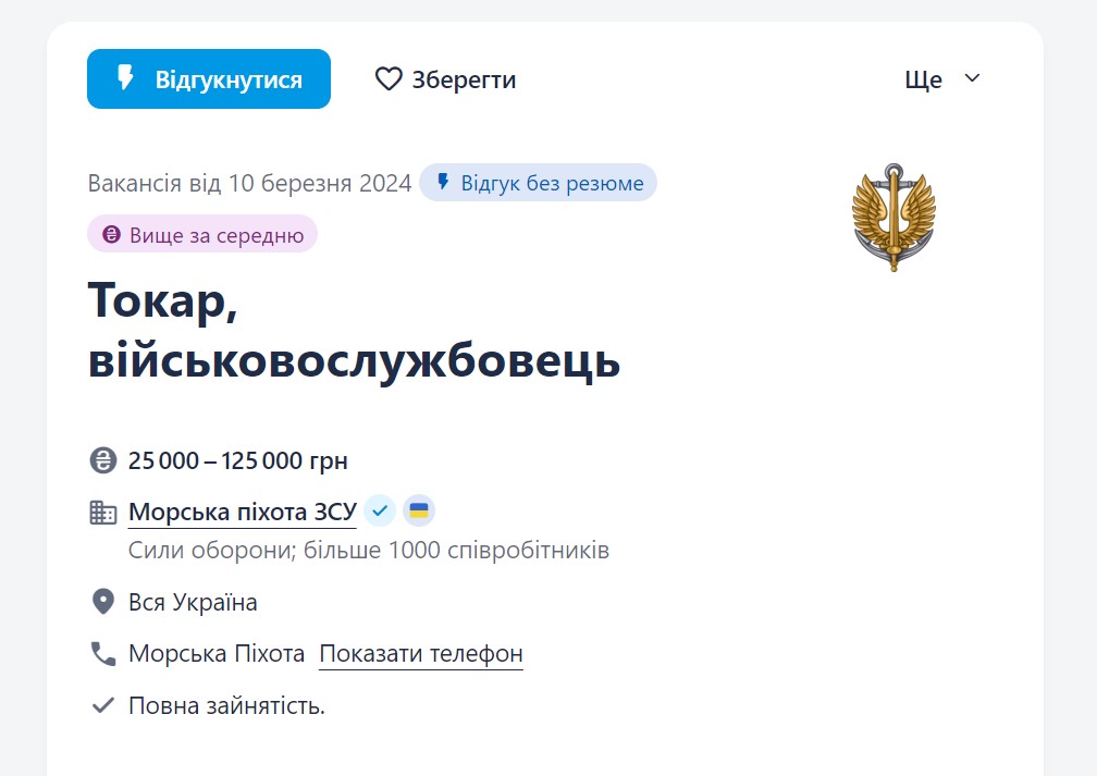 Так, на одном из известных рекрутинговых сайтов, появилась вакансия "Токарь- военнослужащий". Желающим присоединиться к морским пехотинцам, предлагается зарплата от 25 до 125 тысяч гривен, за исполнение своих профобязанностей в зоне боевых действий.