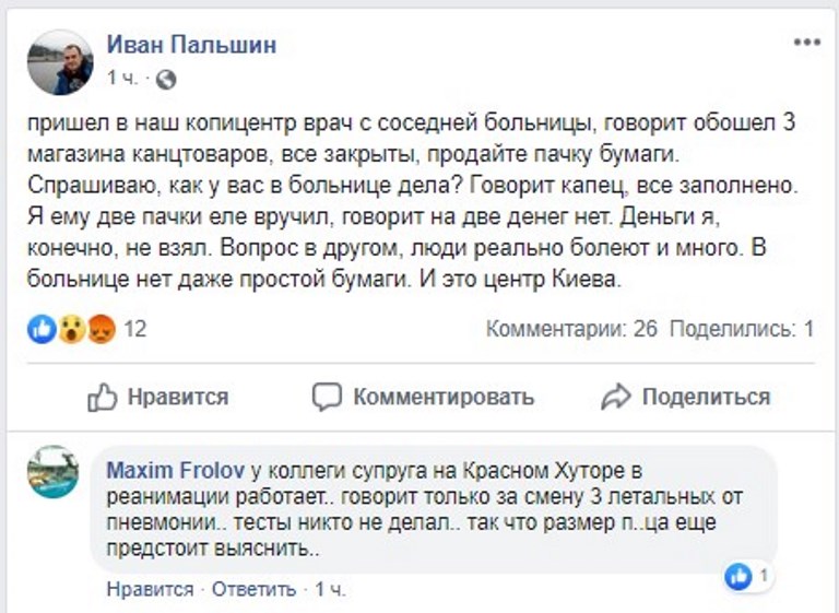 "Пришел в наш копицентр врач с соседней больницы, говорит обошел 3 магазина канцтоваров, все закрыты, продайте пачку бумаги. Спрашиваю, как у вас в больнице дела? Говорит капец, все заполнено. Я ему две пачки еле вручил, говорит на две денег нет. Деньги я, конечно, не взял. Вопрос в другом, люди реально болеют и много. В больнице нет даже простой бумаги. И это центр Киева", - написал он.