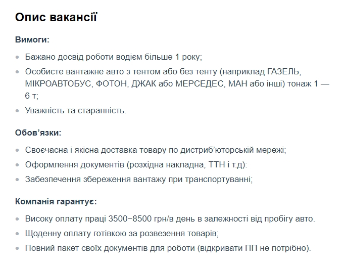 Отмечается, что компания гарантирует высокую оплату труда 3500-8500 грн/день в зависимости от пробега авто. Ежедневная оплата наличными за развоз товаров. Полный пакет своих документов для работы (открывать ПП не нужно).