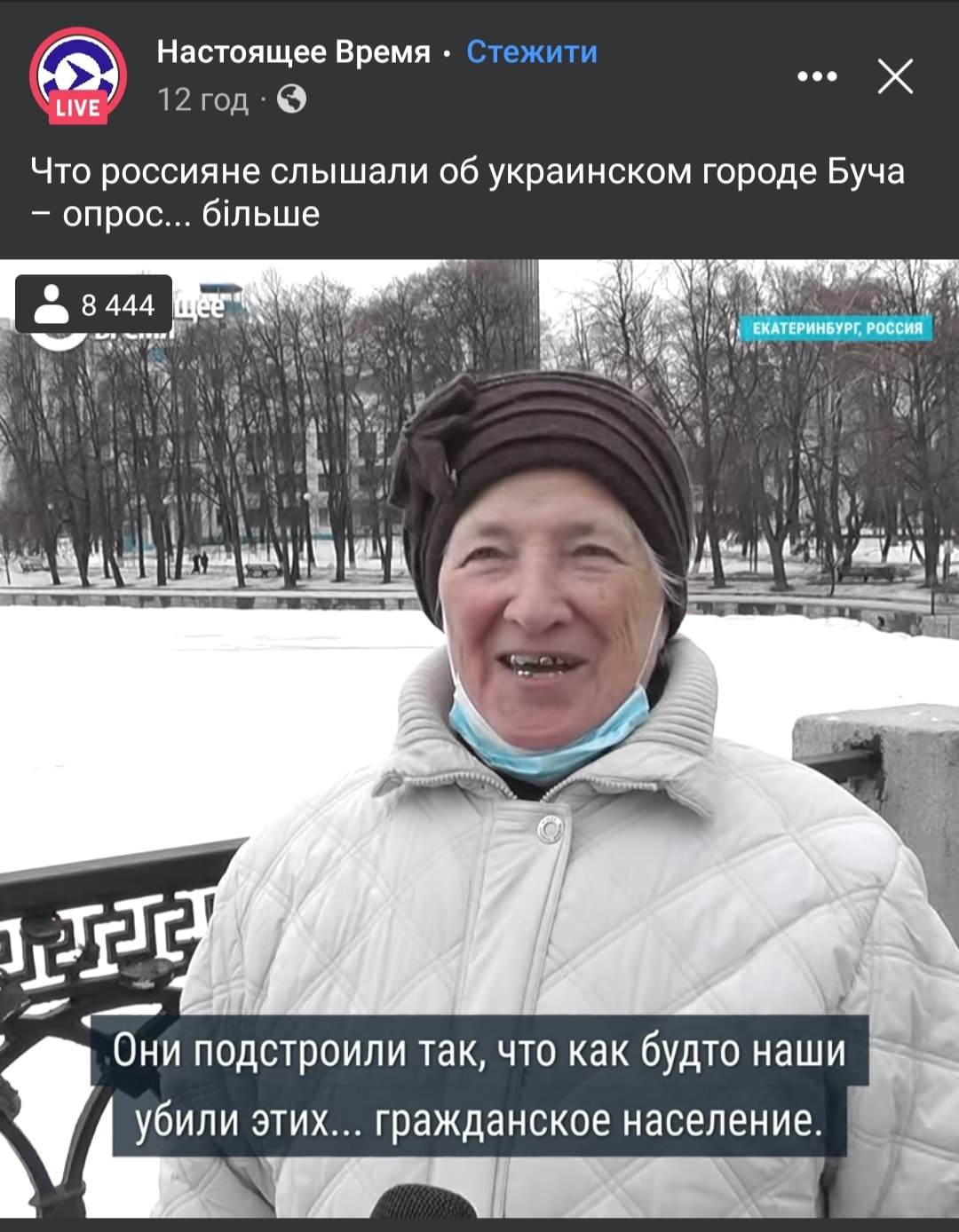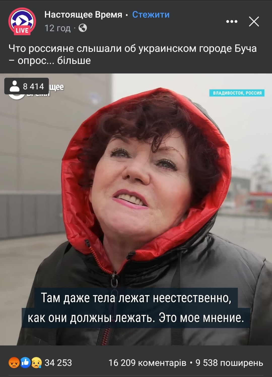 Говоря об украинском городе Буча, где люди больше всего пострадали во время российской оккупации Киевщины, опрошенные уверяли, что знают, как должны "естественно лежать трупы". Мол, тела "не так" лежат.