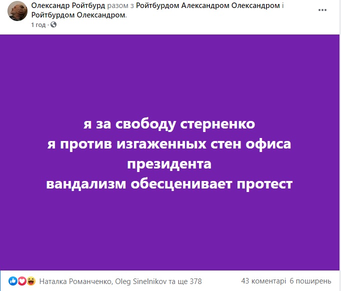 "Я за свободу Стерненко. Я против изгаженных стен Офиса президента. Вандализм обесценивает протест", - написал по этому поводу на своей Facebook-странице известный украинский художник и общественный деятель Александр Ройтбурд.