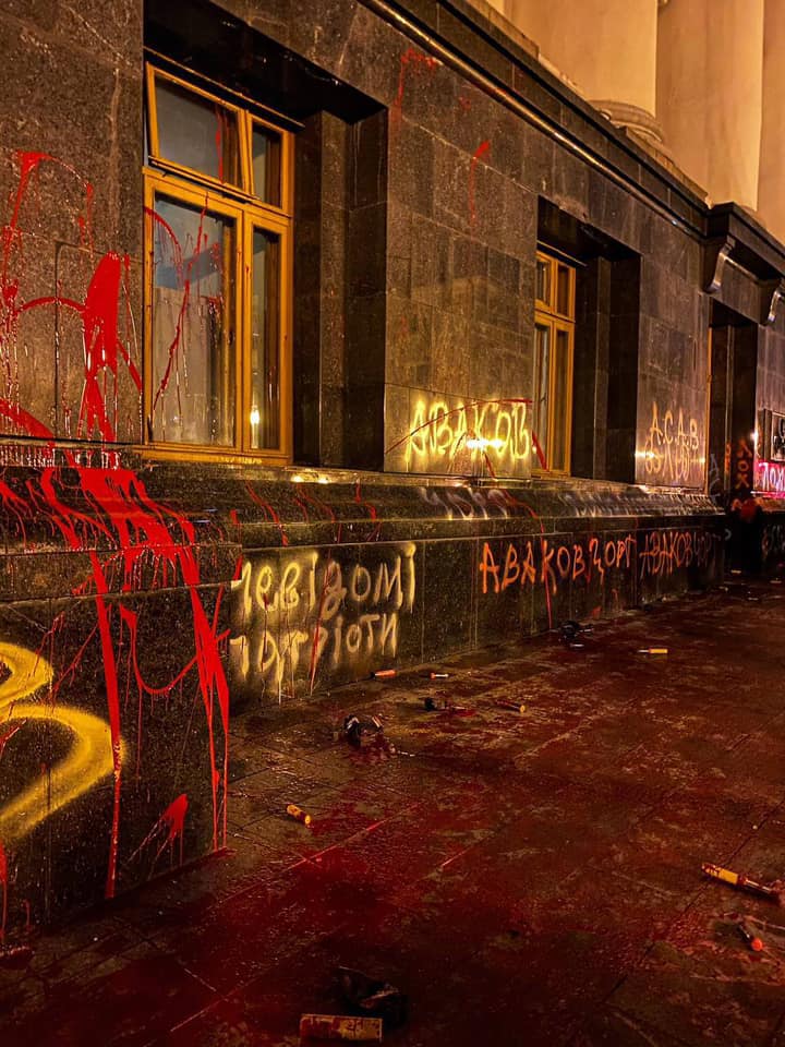 Во время сегоднешней акции активисты, которые пришли под стены ОПУ поддержать осужденного за похищение человека активиста Сергея Стерненко, не только поджыгали традиционные файеры. Перед тем, как огласить свои требования они облили здание Офиса президента красной краской, сделали на нем надписи против министра внутренних дел Арсена Авакова, бросали петарды и файеры в окна, разбив несколько из них, а самые активные пытались попасть в помещение, разбив стекло в дверях. Кто-то попытался поджечь табличку с надписью "Офіс президента України".