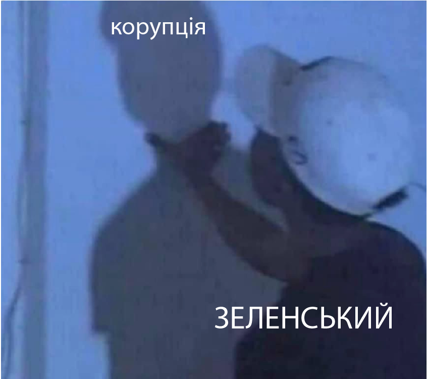 При этом на тени сделана надпись "Коррупция", а на плечах молодого человека – "Зеленский".