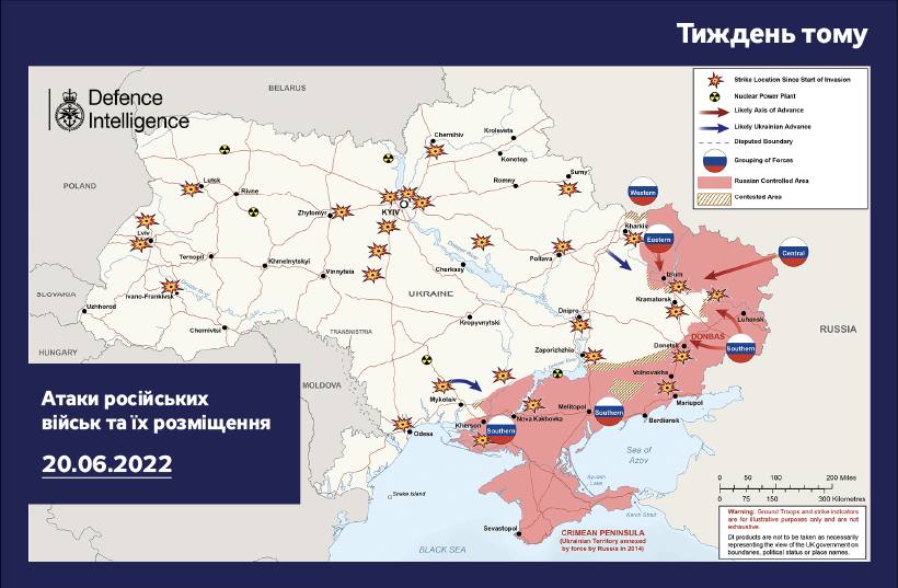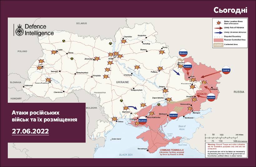 Появилась карта боевых действий в Украине от британской разведки по состоянию на 27 июня.