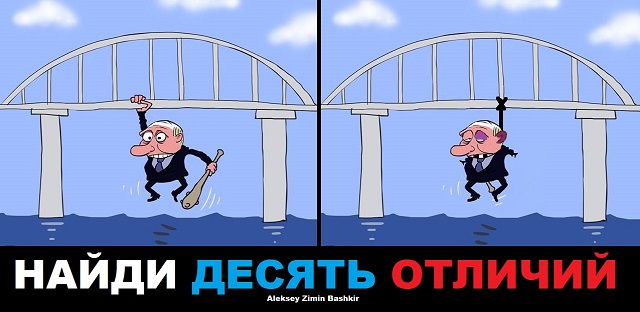 "Найди десять отличий", - подписана карикатура из двух частей. На первой Путин свисает с крымского моста, держась одной рукой за путепровод, а во другою руке он держит дубинку. На второй части картинки российский лидер тоже свисает с моста, но уже с веревкой на шее.