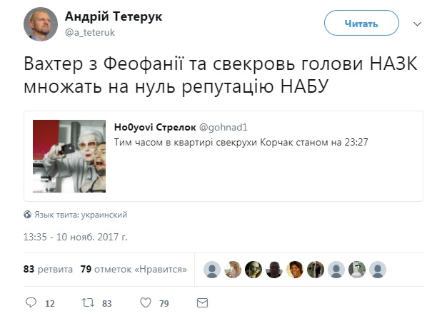 В социальных сетях активно обсуждают случай, когда детектива Национального антикоррупционного бюро (НАБУ) закрыла у себя дома свекровь главы Национального агентства по вопросам предотвращения коррупции (НАПК) Натальи Корчак.