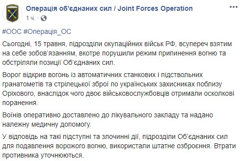Боевики открыли огонь из автоматических станковых и подствольных гранатометов и стрелкового оружия по украинским защитникам вблизи Орехового, в результате чего двое военнослужащих получили осколочные ранения.