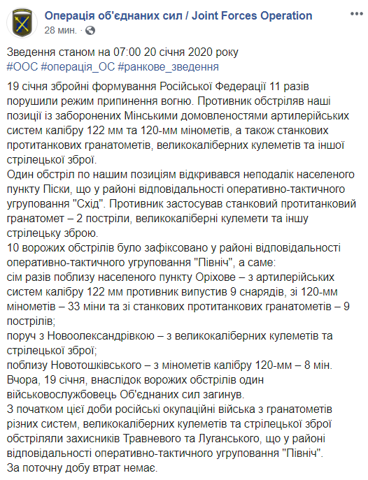 Противник 19 января обстреливал позиции Вооруженных сил Украины из запрещенных Минскими договоренностями артиллерийских систем калибра 122 мм и 120-мм минометов, а также станковых противотанковых гранатометов, крупнокалиберных пулеметов и другого стрелкового оружия.