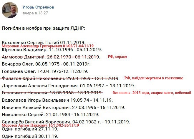 Так, блогер указал на несовпадения по количеству погибших – их оказалось на один меньше, чем сообщил Гиркин, и на несовпадения причин смерти боевиков – двое из них погибли не на Донбассе, а в России (один убит, а второй скончался из-за проблем с сердцем), а также еще один не мог погибнуть на фронте, поскольку в 2015 года утратил ногу.