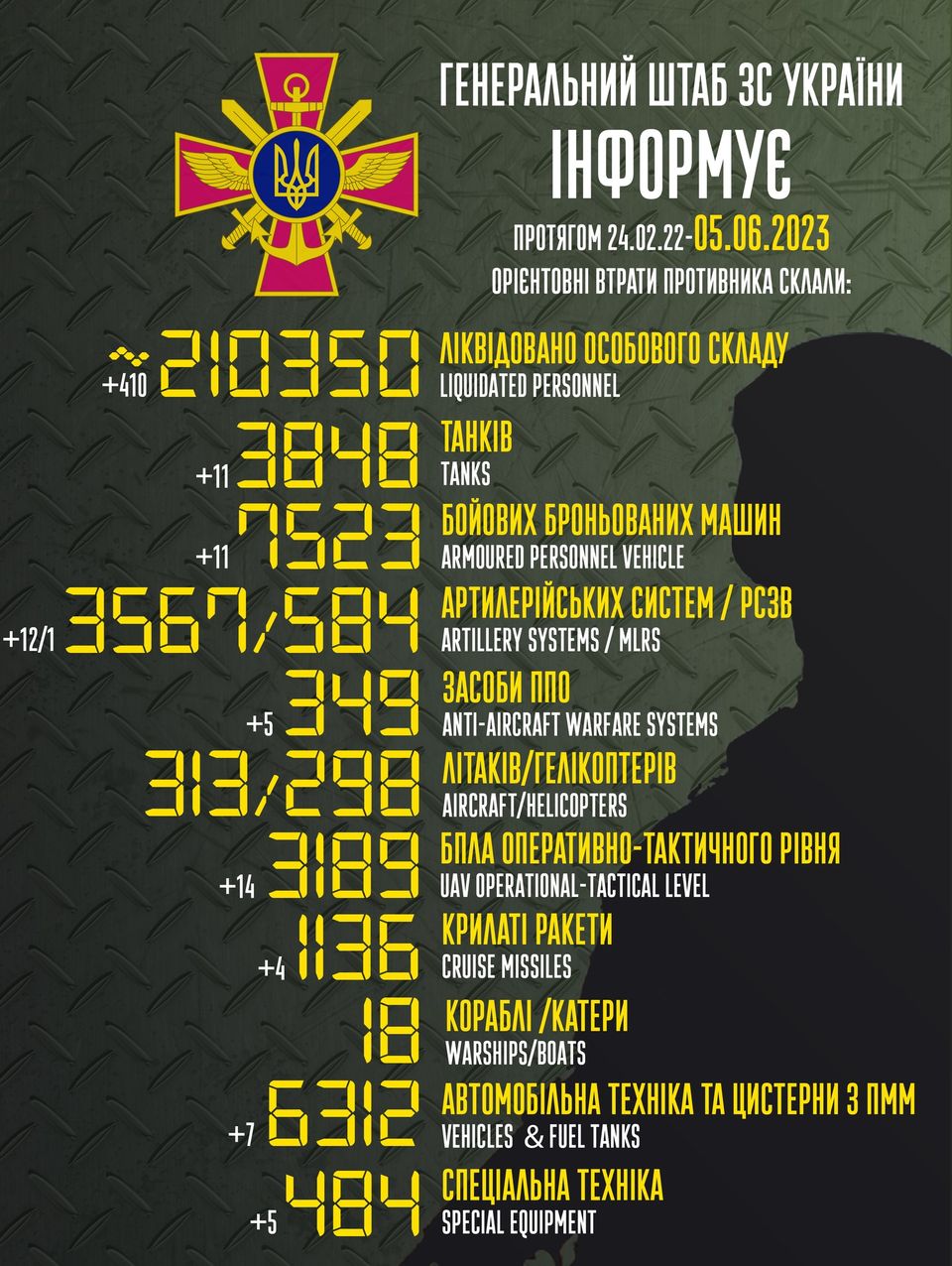 личного состава – около 210350 (+410) человек ликвидировано;