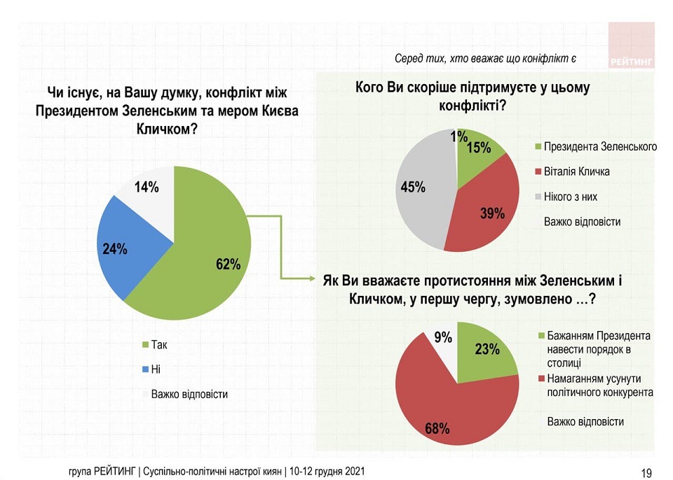 На вопрос "Существует ли, по вашему мнению, конфликт между президентом Зеленским и мэром Киева Виталием Кличко", 62% жителей столицы ответили "Да". Отрицают существование конфликта 24% опрошенных. 14% затруднились с ответом.