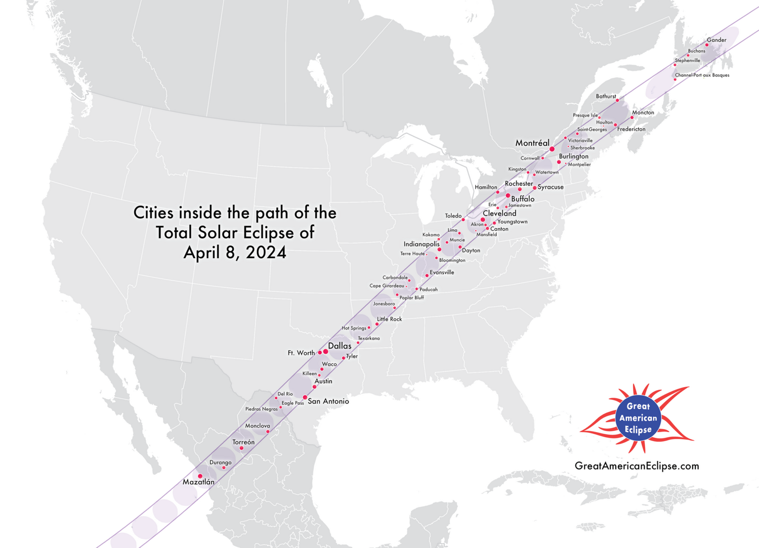 В дальнейшем лунная тень окутает территорию Соединенных Штатов. Полное солнечное затмение будет видно в 15 штатах США, простираясь от Техаса до штата Мэн. В Соединенных Штатах в городе Даллас Луна полностью закроет Солнце. После этого лунная тень проложит свой путь через Канаду, а затем достигнет Атлантического океана. Закончится затмение в 22:55.